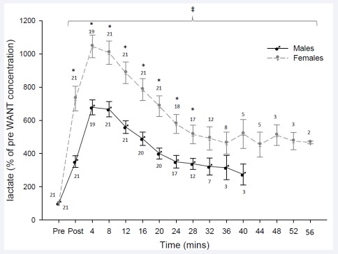 Figure 3: Average lactate collapsed across condition relative to pre WAnT [lactate].The values above each symbol indicate the number of subjects included at each data point. Because the statistical procedure collapses across conditions and all participants completed all recovery protocols the resultant sample is 21 males and 21 females. *Females significantly different than males; ‡ significantly different than Pre. %, percent; pre, average of resting values pre WAnT; post, value immediately after the WAnT; Min: Minutes.
