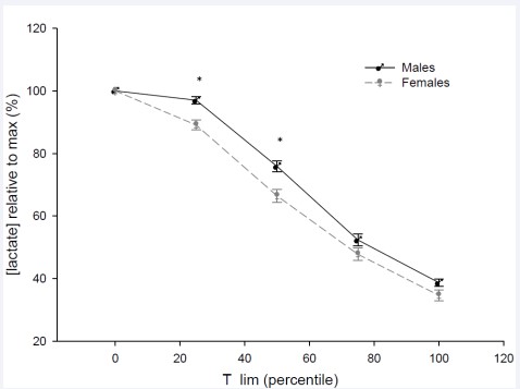 Figure 4: Amount of lactate cleared with respect to time following the WAnT between males and females. All values were normalized to T lim (total clearance time for each subject). *Females significantly different than males. Max, highest lactate concentration obtained following the WAnT; %, percent, T lim, total time taken for each subject to lower their individual blood lactate concentration < 4 mmol/L.