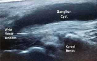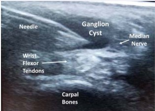 Figure 3: Ultrasound guided needle aspiration of ganglion cyst within the carpal tunnel.