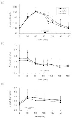 decrease in blood glucose levels and the increase in sympathetic nervous activity elicited by exercise. Additionally, the combination of decreasing insulin levels and increasing sympathetic activity enhanced NEFA release rates [16], and in fact, Larsen et al. [7, 8] demonstrated that cycle ergometer exercise increased NEFA levels. Similar responses in C-peptide and NEFA levels may be evoked by ST-EX of higher intensities and/or longer durations.