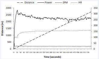 An example of the data collected during the exercise period; distance, power output, strokes per minute and heart rate; are represented graphically in Figure (1). Participants completed 10 minutes of sustained exercise on a rowing machine at an estimated intensity of 50-80% of their VO2max. VO2max was not directly measured using an oxygen consumption device. VO2max was estimated from a formula proposed by Swain et al., [18] based on estimated maximum heart rate (MHR): %MHR = 0.64 x %VO2max + 37
