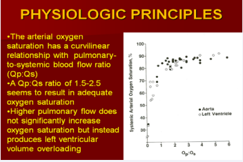 The oxygen saturation is proportional to the amount of the pulmonary blood flow [30,31]. The quantity of pulmonary blood flow is inversely proportional to the degree of obstruction of the pulmonary outflow tract and directly proportional to the size of the PDA when such is present. If a systemic-to-pulmonary artery shunt has been performed by surgery, the pulmonary blood flow is proportional to the size of the shunt. The pulmonary-to-systemic blood flow ratio (Qp:Qs) which represents the pulmonary blood flow has a curvilinear relationship with the arterial oxygen saturation (Figure 2). A Qp:Qs of 1.5 to 2.5 results in an adequate systemic arterial oxygen saturation [31]. An additional increase in Qp:Qs not only does not produce better oxygen saturation, but also subjects the left ventricle to larger volume overloading and, for that reason, is not advisable [31].