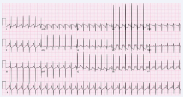 Figure 4: Twelve lead electrocardiogram showing abnormal, superiorly oriented mean QRS vector in frontal plane (-45°, left axis deviation), left ventricular hypertrophy, and diminished anterior (R waves in leads V1 and V2) and rightward (S waves in leads V5 and V6) forces. Prominent P waves, indicative of biatrial enlargement, are also seen in several leads. This electrocardiogram is highly suggestive of tricuspid atresia [17].