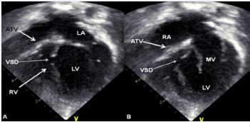 Figure 5: Selected video frames from apical four-chamber, 2-dimensional echocardiographic views of a neonate with tricuspid atresia showing an enlarged left ventricle (LV), a small right ventricle (RV), and a dense band of echoes at the site where the tricuspid valve echo should be (ATV; thick arrow) with closed (A) and open (B) mitral valve (MV). A moderate sized ventricular septal defect (VSD; thin arrow) is shown. LA, Left atrium; RA, Right atrium [36].™Figure 1