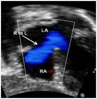Figure 6: Selected video frame from subcostal view of a neonate with tricuspid atresia demonstrating right-to-left (R to L) shunt (arrow) across the interatrial communication. LA, Left atrium; RA, Right atrium [36].