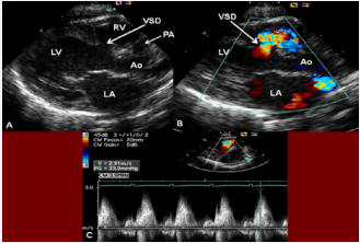 The VSD can be demonstrated by 2D (Figure 7A) and the shunt across it by color (Figure 7B), pulsed, and continuous wave (CW) (Figure 7C) Doppler. The peak Doppler flow velocity across the right ventricular outflow tract (RVOT) and pulmonary valve will help in identifying obstruction across these sites. The Doppler data from the VSD and RVOT are helpful in the estimating of pulmonary artery pressures.