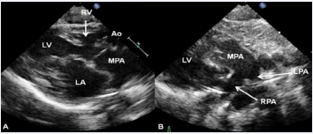 Figure 8 A): Selected video frame from parasternal long axis views of a neonate with tricuspid atresia and transposition of the great arteries demonstrating left atrium (LA), left ventricle (LV), a very small right ventricle (RV), and a moderate-sized ventricular septal defect (not marked). The vessel coming off of the LV is traced in B and shown to bifurcate into left (LPA) and right (RPA) pulmonary arteries, confirming that this vessel is the main pulmonary artery (MPA). Ao, Aorta [36].