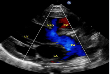Echo-Doppler studies are also useful in demonstrating an ASD/PFO with a right-to-left shunt (Figure 6) and a VSD with a left-to-right shunt (Figure 7).