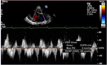 In Type I (normally related great arteries) patients, the VSD peak Doppler velocity is helpful in estimating the size of the VSD; the higher the velocity, the smaller is the VSD. The RV and pulmonary arterial (PA) pressure may also be estimated using the modified Bernoulli equation: