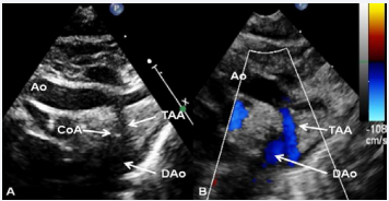 Figure 11: Selected video frames from suprasternal notch views of the aortic (Ao) arch in 2D (A) and color flow (B) images of a neonate with tricuspid atresia and transposition of the great arteries demonstrating coarctation of the aorta (CoA) and hypoplastic transverse aortic arch (TAA). The association of CoA with tricuspid atresia plus transposition of the great arteries is well known [36].