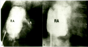 Figure 12: Selected cine frames of right atrial (RA) cineangiogram in postero-anterior projection of two patients with tricuspid atresia demonstrating blind ending of the right atria. Faint opacification of left atrium (LA) is seen a [38].