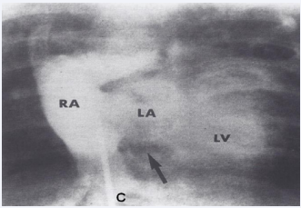 Figure 13: Selected cine frame from right atrial (RA) angiogram in postero-anterior projection of an infant with tricuspid atresia demonstrating sequential opacification of the left atrium (LA) and left ventricle (LV) without opacification of the right ventricle. The right ventricular window (arrow) is formed by the RA on the right, the LA superiorly, and the LV on the left. This is a classic appearance of the muscular type of tricuspid atresia. C, catheter [1].