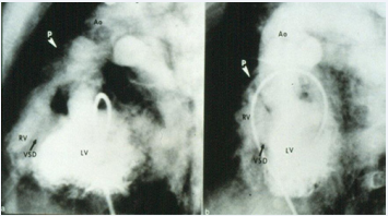 Figure 14: Selected cine frames from left ventricular (LV) angiogram in straight lateral (a) and left anterior oblique (b) views in a patient with Type I tricuspid atresia demonstrating origin of the aorta (Ao) from the LV and the pulmonary artery (P) (white arrow head) from the right ventricle (RV). A large ventricular septal defect (VSD) (black arrow) is also shown [27].