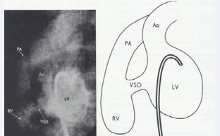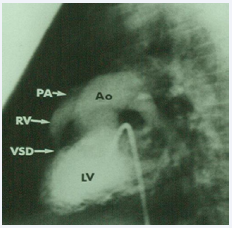 Figure 15: Selected cine frames from left ventricular (LV) angiogram in straight lateral view in a patient with Type I tricuspid atresia demonstrating a moderate-sized ventricular septal defect (VSD) in the muscular ventricular septum. Ao, aorta; PA, pulmonary artery; RV, right ventricle [20].