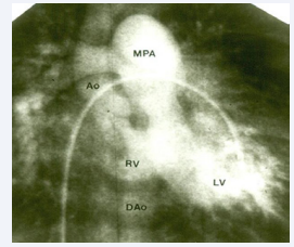 Figure 17: Selected cine frames from left ventricular (LV) angiogram in postero-anterior view in a patient with Type II tricuspid atresia demonstrating origin of the pulmonary artery (MPA) from the LV and the aorta (Ao) from the right ventricle (RV). The RV appears to opacify from the LV via a ventricular septal defect (not labeled) [38].