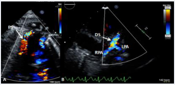 Figure 18: Selected video frames from suprasternal notch view demonstrating proximal shunt (PS) by color flow imaging (A). In a slightly different view (B), the flow from the distal shunt (DS) into right (RPA) and left (LPA) pulmonary arteries is shown [69].