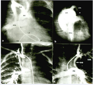 Figure 19: Selected cine frames of angiograms in postero-anterior projection in patients with tricuspid atresia who have undergone classic (a and b) and modified (c and d) Blalock-Taussig shunts. Apart from demonstrating the shunts, the angiographic fames show pulmonary artery (PA) anatomy. Also, note marked narrowing of the left Blalock-Taussig shunt in b. AA, arch of the aorta; DAo, descending aorta; GG, Gore-Tex graft; LA, left atrium; LV, left ventricle; LPA, left pulmonary artery; LSA, left subclavian artery; RA, right atrium; RIA, right innominate artery; RPA, right pulmonary artery; RSA, right subclavian artery [38].