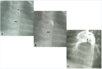 Figure 20: A) Selected cine frame demonstrating the position of a guide wire which was advanced from the aorta into the main pulmonary artery (via the ductus arteriosus) and from there into the right ventricle. The balloon/stent (St) assembly was then positioned within the ductus. The arrow demarcates the articulation (A) within the stent. B) The balloon carrying the stent is inflated within the ductus. C) An aortic arch (AA) angiographic frame shows the stented ductus (St) and good opacification of the right (R) and left (L) pulmonary arteries [66].