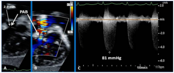 Figure 21 Selected echocardiographic video frames demonstrating pulmonary artery band (PAB) with narrow diameter of 2.9 mm by 2D (A) and by color flow (B) and a high gradient (81 mmHg) by continuous wave Doppler (C) are shown [69].