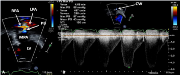 Figure 22: Selected echocardiographic video frames demonstrating pulmonary artery band (PAB) with narrow diameter by color flow (A) and a high gradient (88 mmHg) by continuous wave Doppler (B) are shown [69]..