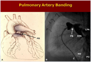 Figure 23: A) Diagrammatic portrayal of pulmonary artery banding (PB) for patients with markedly increased pulmonary blood flow and severe congestive heart failure. B) Selected cine frame form pulmonary artery cineangiogram in straight lateral view demonstrating constriction of the pulmonary artery (PB; arrow). C, catheter; LPA, left pulmonary artery; NG, nasogastric tube; PG, pigtail catheter; RPA, right pulmonary artery [32].