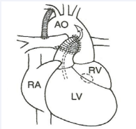 Figure 24: A. Line drawing illustrating Damus-Kaye-Stansel procedure. The left ventricular (LV) blood flows via the ventricular septal defect (circle) and right ventricle (RV) into the aorta (Ao). If the VSD is small and restrictive, causing “subaortic” obstruction, this obstruction may be bypassed by connecting the proximal stump of the divided pulmonary artery to the Ao directly or a via a non-valved conduit. The pulmonary arteries are supplied with a Blalock-Taussig shunt [20,21].