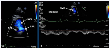 Figure 25 :Selected video frames from suprasternal notch view demonstrating bidirectional Glenn shunt; the superior vena cava (SVC) is shown emptying into the right (RPA) and left (LPA) pulmonary arteries by color flow imaging (A). Low Doppler flow velocity across the shunt (B) indicates unobstructed Glenn [69].