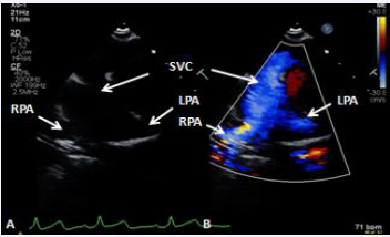 Figure 26: Selected video frames from suprasternal notch view demonstrating bidirectional Glenn shunt; the superior vena cava (SVC) is shown emptying into the right (RPA) and left (LPA) pulmonary arteries by two dimensional (A) and color flow imaging (B) [69].