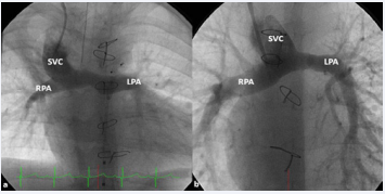 Figure 27: Selected cine frames in postero–anterior (a) and sitting up (b) views, demonstrating bidirectional Glenn procedure (the superior vena cava [SVC] is anastomosed with the right pulmonary artery [RPA]) in two different patients during Stage II of Fontan procedure. Unobstructed flow from the SVC to the right (RPA) and left (LPA) pulmonary arteries is shown [82].