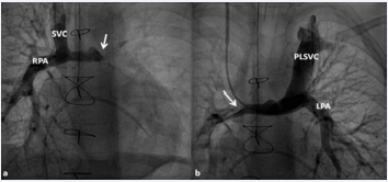 Figure 28: Selected cineangiographic frames showing a bilateral bidirectional Glenn procedure (Stage II). In a, an injection into the superior vena cava (SVC) shows prompt opacification of the right pulmonary artery (RPA). The arrow in a points to the unopacified blood from a persistent left superior vena cava (PLSVC). In b, an injection into the PLSVC shows prompt opacification of the left pulmonary artery (LPA). The arrow in b points to the unopacified blood from the right SVC. Note the unobstructed flow from the respective SVCs into the pulmonary arteries [82].