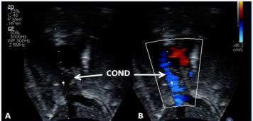 Figure 29: Selected video frame demonstrating wide open conduit (COND) by 2D (A) and color flow imaging (B). Note laminar flow in B indicating no obstruction [69].