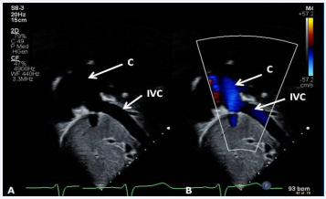 Figure 30: Selected video frames demonstrating connection between the inferior vena cava (IVC) and the conduit (C) by 2D (A) and color flow imaging (B); note that the IVC–C junction is wide open [69].