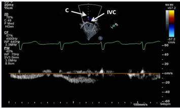 Figure 31: Selected video frame demonstrating low velocity flow between the inferior vena cava (IVC) and the conduit (C) shown in Figure 30, suggesting no evidence for obstruction [69].