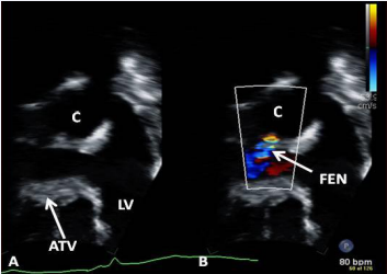 Figure 32: Selected video frames (A and B) from an apical four chamber view focusing on the conduit (C) (A) and with color flow imaging (B) demonstrating fenestration (FEN). ATV, atretic tricuspid valve; LV, left ventricle [69].