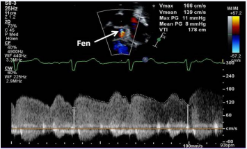 Figure 33: Selected video frame with Doppler sampling across the fenestration (Fen) demonstrating a mean gradient of 8 mmHg [69].
