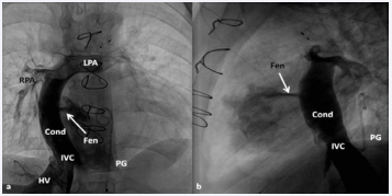 Figure 34 Selected cine frames in postero–anterior (a) and lateral (b) views, demonstrating Stage IIIA Fontan procedure diverting the inferior vena caval (IVC) flow into the pulmonary arteries via a nonvalved conduit (Cond). Flow across the fenestration (Fen) is shown by arrows in a and b. HV, hepatic veins; LPA, left pulmonary artery; PG, pigtail catheter in the descending aorta; RPA, right pulmonary artery [82].