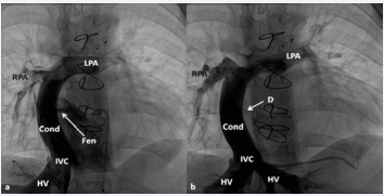 Figure 35: Selected cineangiographic frames in antero–posterior view, demonstrating Stage IIIA of the Fontan procedure: diverting the inferior vena caval (IVC) flow into the pulmonary arteries via a nonvalved conduit (Cond). Note the fenestration (Fen) shown by the arrow in a. The Fen is closed with an Amplatzer device (D), shown by the arrow in b (Stage IIIB). HV, hepatic veins; LPA, left pulmonary artery; RPA, right pulmonary artery [82].
