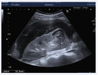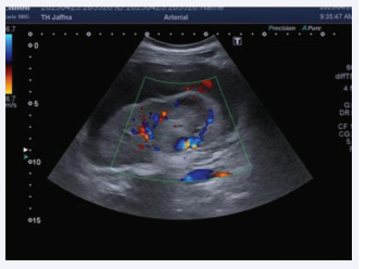 On post operative day 2 she was presented with persistent severe abdominal pain and on examination patient was afebrile, mildly pale, had blood pressure in the upper margins and low urine output with no evidence of hematuria. Post-operative Hb was 6.9 g/dL and she was transfused 2 pints of blood, correcting Hb to 9.0 g/dL. Serum creatinine levels were normal but slowly rising, from 68 to 98 µmol/L. Urine full report negative and inflammatory markers were not elevated. Ultrasound Scan of the abdomen was performed to find the cause for her symptoms [5-9].