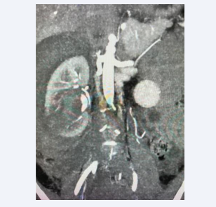 Subsequently, CT angiogram confirmed a ruptured pseudo aneurysm with intra renal and intra- capsular haematoma (Figure 3).