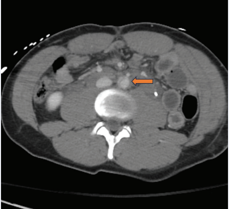 Figure 1: Computed tomographic image of abdomen obtained upon emergency department arrival which shows circumferential transection of the intima of the abdominal aorta (arrow).