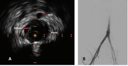 Figure 2: Intraoperative intravascular ultrasound, A, which confirms complete circumferential disruption of the intima of the aorta just below the take-off of the inferior mesenteric artery (IMA), also seen on catheter-based angiography, B.