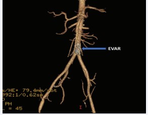 Figure 3: Follow-up computed tomographic angiography, maximum intensity 3-D projection obtained prior to hospital discharge demonstrating complete exclusion of the area of injury with the endovascular stent graft (EVAR), as well as widely patent iliofemoral run-off vessels.