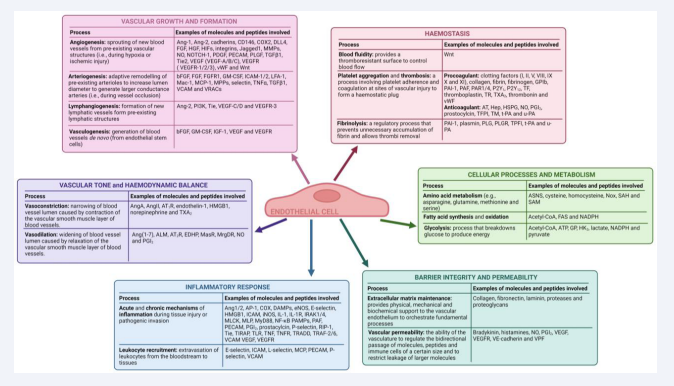 Abbreviations: Acetyl-CoA: Acetyl Coenzyme A; ALM: Almandine; Ang: Angiopoietin; AngA: Angiotensin A; AngII: Angiotensin II; Ang(1-7): Angiotensin 1-7; AP-1: Activator Protein-1; ASNS: Asparagine Aspartate; AT: Antithrombin; ATP: Adenosine Triphosphate; AT1R: Angiotensin Type 1 Receptor; bFGF: basal Fibroblast Growth Factor; CD146: Cluster Differentiation 146; COX: Cyclooxygenase; DAMPs: Danger-Associated Molecular Patterns; DLL4: Delta-Like Ligand 4; EDHP: Endothelium-Derived Hyperpolarising Factor; eNOS: Endothelial Nitric Oxide Synthase; FGFR: Fibroblast Growth Factor Receptor; FAS: Fatty Acid Synthase; FGF: Fibroblast Growth Factor; GM-CSF: Granulocyte-Macrophage Colony-Stimulating Factor; GP: Glycerate 3-Phosphate; GPIb: Glycoprotein Ib; Hep: Heparin-like molecules; HGF: Hepatocyte Growth Factor; HIF: Hypoxia-Inducing Factor; HK: Hexokinase 2; HMGB1: High-Mobility Group Box-1; HSPG: Heparan Sulfate Proteoglycans; ICAM: Intracellular Adhesion Molecule; IGF: Insulin-Like Growth Factor; iNOS: inducible Nitric Oxide Synthase, IL-1: Interluikin-1, IL1R: Interluikin-1 Receptor; IRAK: IL-1R-Associated Kinase; LFA: Lymphocyte Function-Associated Antigen; MasR: MAS1 Oncogene Receptor; MCP-1: Monocyte Chemoattractant Protein-1; MLCK: Myosin-Light-Chain Kinase; MLP: Myosin Light Chain; MMPs: Matrix Metalloproteinases; MrgDR: MAS1 Oncogene, G-coupled Receptor; MyD88: Myeloid Differentiation Factor 88; NADH: Nicotinamide Adenine Dinucleotide Phosphate; NF-κB: Nuclear Factor Kappa B; NO: Nitric Oxide; Nox: NADPH Oxidase; PAF: Platelet-Activating Factor; PAI-1: Plasminogen Activator Inhibitor 1; PAMPs: Pattern-Associated Molecular Patterns; PAR: Protease Activating Receptor; PDGF: Platelet-Derived Growth Factor; PECAM: Platelet Endothelial Cell Adhesion Molecule; PGI2: Prostaglandin I2; PI3K: Phosphoinositide 3-Kinase; PLGF: Placental Growth Factor; PLG: Plasminogen; PLGR: Plasminogen Receptor; P2Y1: Purinergic Receptor P2Y G protein-coupled 1; RIP-1: Receptor-Interacting Protein 1; SAH: S-Adenosylhomocysteine; SAM: S-adenosylmethionine; TF: Tissue Factor; TFPI: Tissue Factor Pathway Inhibitor; TGF: Transforming Growth Factor; Tie: Angiopoietin Receptor; TIRAP: Toll/IL-1 Receptor Accessory Protein; TLR: Toll-Like Receptor; TM: Thrombomodulin; TNF: Tumor-Necrosis Factor; TNFR: TNF Receptor; TR: Thromboxane Receptor; TRADD: TNFR-Associated Via Death Domain Protein; TRAF: TNFR-Associated Factor; TXA2: Thromboxane; t-PA: tissue Plasminogen Activator; u-PA: urokinase Plasminogen Activator; VCAM: Vascular Cell Adhesion Molecule; VEGF: Vascular Endothelial Growth Factor; VEGFR: Vascular Endothelial Growth Factor Receptor; VRACs: Volume Regulated Anion Channels; vWF: von Willebrand Factor; Wnt: Wingless/integrated