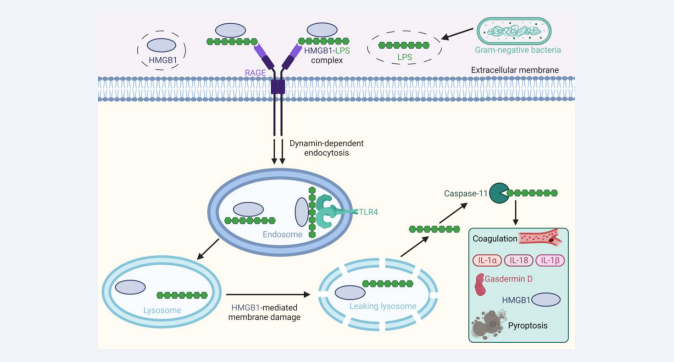 Figure 2: HMGB1 transports multiple extracellular DAMPs and PAMPs, here exemplified by LPS, into the inside of endothelial cells. HMGB1 has two LPS-binding sites and thus forms an extracellular HMGB1–LPS complex that gets endocytosed via RAGE to the endolysosomal system. High intralysosomal levels of HMGB1 present at low pH damages the lysosomal membrane enabling LPS to leak into the cytosol culminating in activation of the intracellular LPS sensor caspase-11 (caspases-4 and −5 in humans) that instigates inflammation and coagulation.
