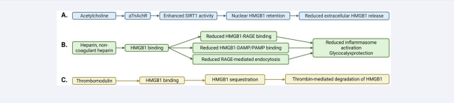 Activating the Endogenous Cholinergic Anti-Inflammatory Pathway to Inhibit HMGB1 Release and to Reduce RAGEMediated Endocytosis of HMGB1-DAMP/PAMP Complexes: Inflammation is regulated by the nervous system, but this insight has so far not led to any clinical therapy for sepsis. Neuronally released HMGB1 accelerates inflammation, while acetylcholine, released via the cholinergic anti-inflammatory pathway, in contrast inhibits excessive inflammation [61,62]. Acetylcholine is released in all vagally innervated, organs including the celiac ganglion, where it activates the catecholaminergic splenic nerve to discharge norepinephrine in the spleen to stimulate a subset of splenic T lymphocytes capable of acetylcholine synthesis [63]. These activated T cells may then leave the spleen and function like mobile neurons to release acetylcholine that will down-regulate inflammation in body compartments that lack vagal innervation. The cholinergic mechanism inhibits proinflammatory HMGB1 release via signals that require acetylcholine and alpha-7 nicotinic acetylcholine receptors (α7nAchR) (Figure 3A) [64, 65].