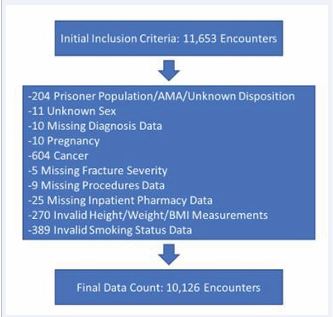 Inclusion criteria for this study were any patients over the age of 18 entered into the database with a diagnosis of a fracture of the tibia (including tibial plateau fractures, tibial shaft fractures, and tibial pilon fractures). Exclusion criteria were 1) incomplete or incorrect database entry for data points used in the regression analysis (age, gender, BMI, smoking status, etc.), 2) patients with a diagnosis of cancer, 3) patients who left the hospital against medical advice (AMA) or were part of a prisoner population, 4) those with missing inpatient pharmacy data, 5) patients with polytrauma (additional extremity fractures or those who required surgery during their hospitalization for anything other than treatment of a tibia fracture), and 6) patients who were pregnant at the time of fracture. Figure 1 depicts a flowchart of patient exclusion criteria. Endpoints were VTE diagnosis within one year from injury.