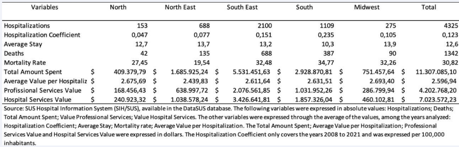 To describe the profile of hospitalizations due to ED, the variables used were: number of hospitalizations; hospitalization coefficient; average length of stay; total length of stay; total amount spent; cost of professional services; cost of hospital services; average cost per hospitalization; deaths and mortality rate. These variables were also analyzed according to their distribution in Brazil’s demographic regions (North, Northeast, Midwest, Southeast, South) and according to the nature of the procedure (emergency, elective and other external causes). Given the statistical insignificance of the data recorded as “other external causes”, they were not analyzed in this study. To calculate the hospitalization coefficient, the number of hospitalizations was divided by the resident population in the respective year and region and multiplied by 100,000. The data on the resident population was taken from the demographic and socio-economic indicators in the “Study of Population Estimates by Municipality, Sex and Age - 2000-2021”, available on the DataSUS database. As it is a public health database, analysis by the Ethics Committee was not required.