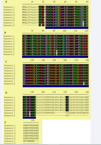 MEGA7 software was used to align all sequences (Figure 1), and Gblocks online software was used to analyze the conservation site among all 8 sequences (Figure 1) [14,15]. Utilization of MEGA 7 makes sequences orderly arranged. Conservative sites were provided by Gblocks and underlined in blue line. As a result, the conservation sequences were selected and exhibited in Table 1.
