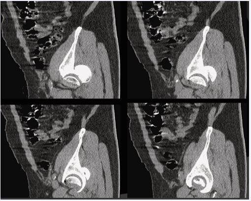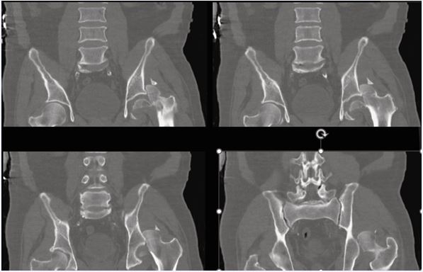 Figure 3 Pre-operative hip CT (sagittal reconstructions) Sagittal reconstructions highlighting intra-articular fragments and femoral head involvement.