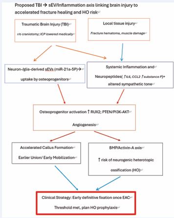 Discussion: Evidence supports early definitive fixation once resuscitation targets are met. A neuron?derived sEV/miR?21–inflammation axis provides a mechanistic rationale for expedited osteogenesis after TBI, while underscoring proactive NHO surveillance/prophylaxis.